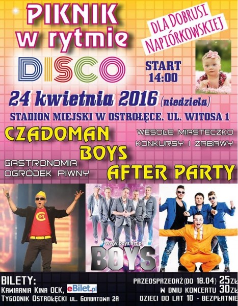 W Ostrołęce i okolicach wciąż nie brakuje ludzi dobrej woli, którzy stale pomagają dziewczynce, organizując różnego rodzaju akcje charytatywne. Kolejna odbędzie się już 24 kwietnia na stadionie przy ul. Witosa. W trakcie plenerowego koncertu disco polo zaprezentują się największe gwiazdy tego gatunku muzycznego - Boys, After Party i Czadoman. Koncert jest biletowany, przedsprzedaż wejściówek w cenie 25 złotych potrwa do 18 kwietnia, po tym dniu koszt biletów wyniesie 30 zł. Bilety do nabycia w serwisie ebilet.pl oraz w siedzibie "Tygodnika Ostrołęckiego" przy ul. Gorbatowa 2A i w kawiarni Ostrołęckiego Centrum Kultury przy ul. Inwalidów Wojennych.