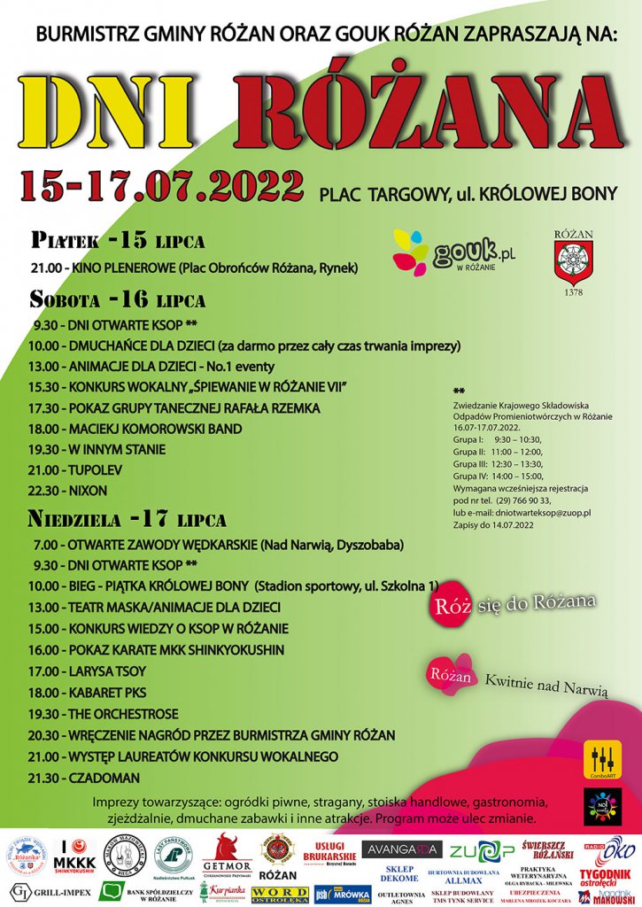 Główna część imprezy odbędzie się na Placu Targowym w Różanie. W sobotę na scenie pojawi się ostrołęcki zespół Tupolev. W niedzielę na zakończenie publiczność do tańca porwie Czadoman.