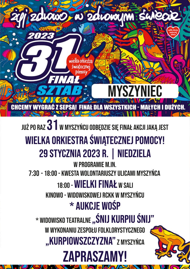 Myszyniecki sztab Wielkiej Orkiestry Świątecznej Pomocy został zarejestrowany przy Regionalnym Centrum Kultury Kurpiowskiej. Dzięki temu to właśnie w sali widowiskowej RCKK odbędzie się część koncertowa finału. Na scenie specjalnie dla wolontariuszy i mieszkańców wspierających datkami akcję WOŚP wystąpi zespół folklorystyczny Kurpiowszczyzna prezentując spektakl “Śnij Kurpi Śnij!”.
