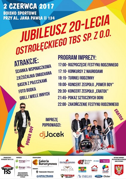 2 czerwca na osiedlu bloków OTBS przy alei Jana Pawła II odbędzie się festyn rodzinny z okazji przypadającego w tym roku jubileuszu 20-lecia istnienia spółki. Na swoje urodziny Ostrołęckie TBS przygotowało moc atrakcji. Jedną z nich będzie koncert z udziałem gwiazdy disco polo Power Boya. Podczas pikniku rodzinnego zagra także grupa Eratox.