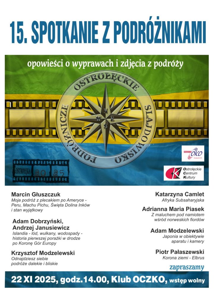 Zapraszamy serdecznie w najbliższą sobotę, 22 listopada, o godzinie 14:00 do Klubu Oczko na wyjątkowe wydarzenie: 15. Ostrołęckie Slajdowisko Podróżnicze – spotkania ostrołęckich podróżników. Jubileuszowa edycja zapowiada się niezwykle barwnie i różnorodnie.