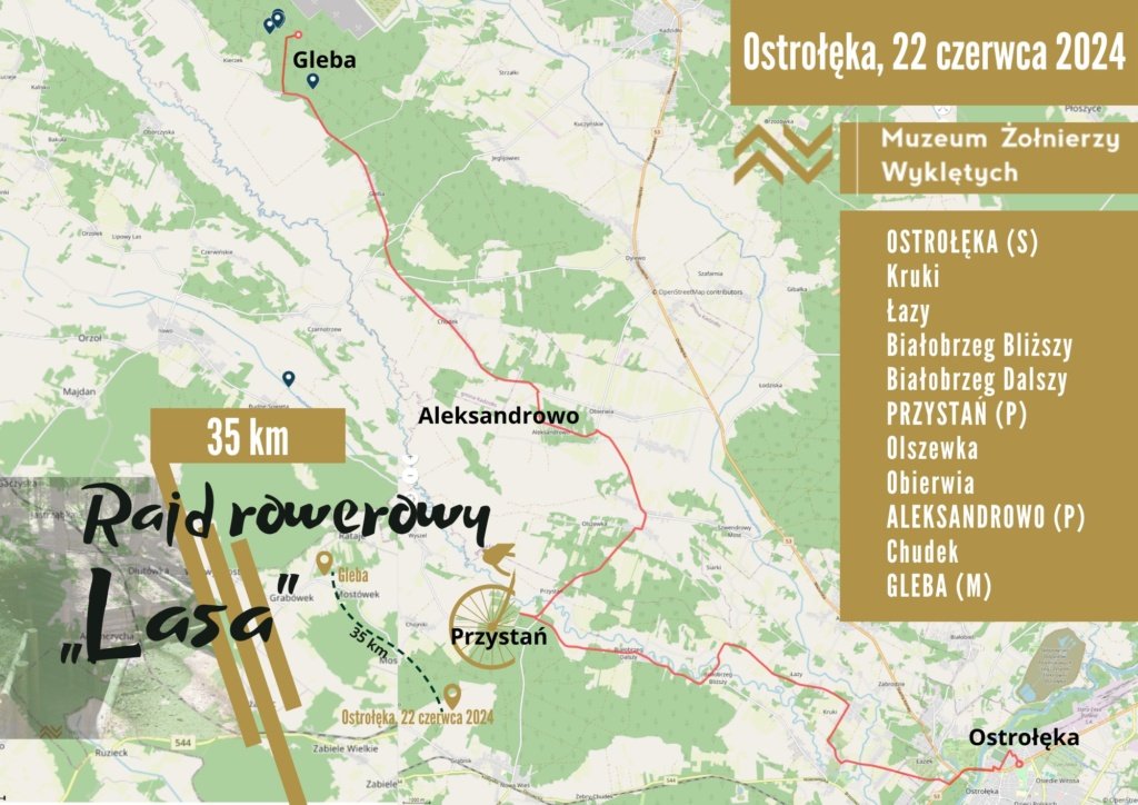 2 Rajd Rowerowy „Lasa” rozpocznie się o godz. 10.00. Uczestnicy wyruszą w trasę liczącą ok. 35 km z Ostrołęki do Gleby, gm. Kadzidło przez Kruki, Łazy, Białobrzeg Bliższy, Białobrzeg Dalszy, Przystań, Olszewkę, Obierwię Aleksandrowo i Chudek.