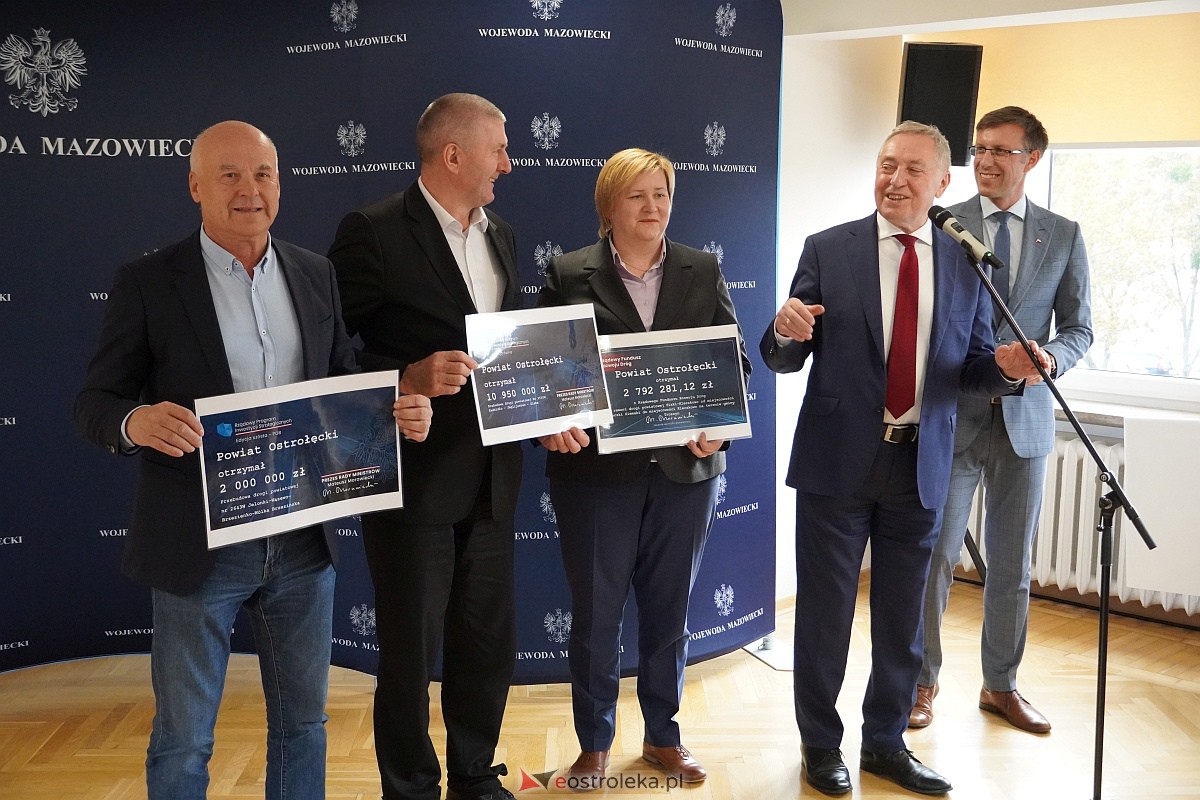 Cztery symboliczne czeki dla Powiatu Ostrołęckiego o łącznej wartości ponad 45 mln zł odebrali dziś z rąk ministra Henryka Kowalczyka w Delegaturze Mazowieckiego Urzędu Wojewódzkiego w Ostrołęce starostowie: Stanisław Kubeł i wicestarosta Krzysztof Parzychowski.