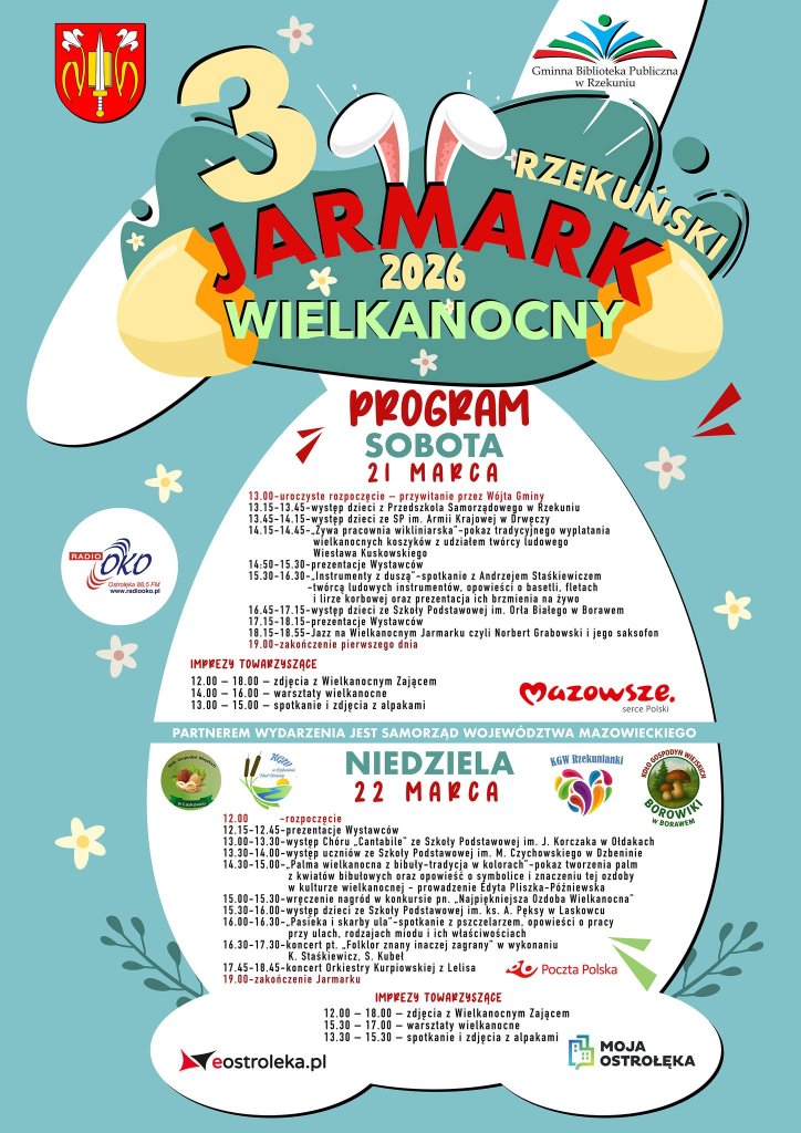 Jeśli czujecie już w powietrzu wiosnę i powoli zaczynacie myśleć o wielkanocnych przygotowaniach, koniecznie zarezerwujcie sobie przedostatni weekend marca. Przed nami 3. Rzekuński Jarmark Wielkanocny, który odbędzie się w dniach 21-22 marca.