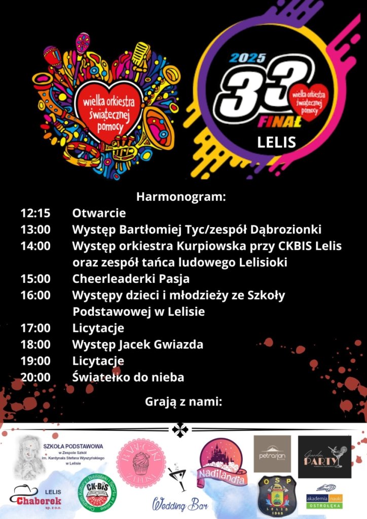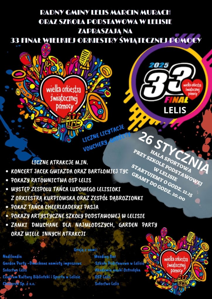 W niedzielę, 26 stycznia, Lelis stanie się jednym z miejsc, gdzie rozbrzmią dźwięki 33. Finału Wielkiej Orkiestry Świątecznej Pomocy. Wydarzenie, którego celem jest zbiórka funduszy na walkę z chorobami nowotworowymi wśród dzieci, odbędzie się w hali sportowej przy Szkole Podstawowej w Lelisie. Start zaplanowano na godzinę 12:15.
