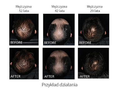 - Zatrzymuje proces wypadania włosów i łysienia o rożnym podłożu, stymuluje wzrost oraz zmniejsza utratę włosów,