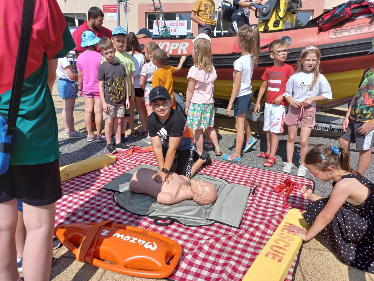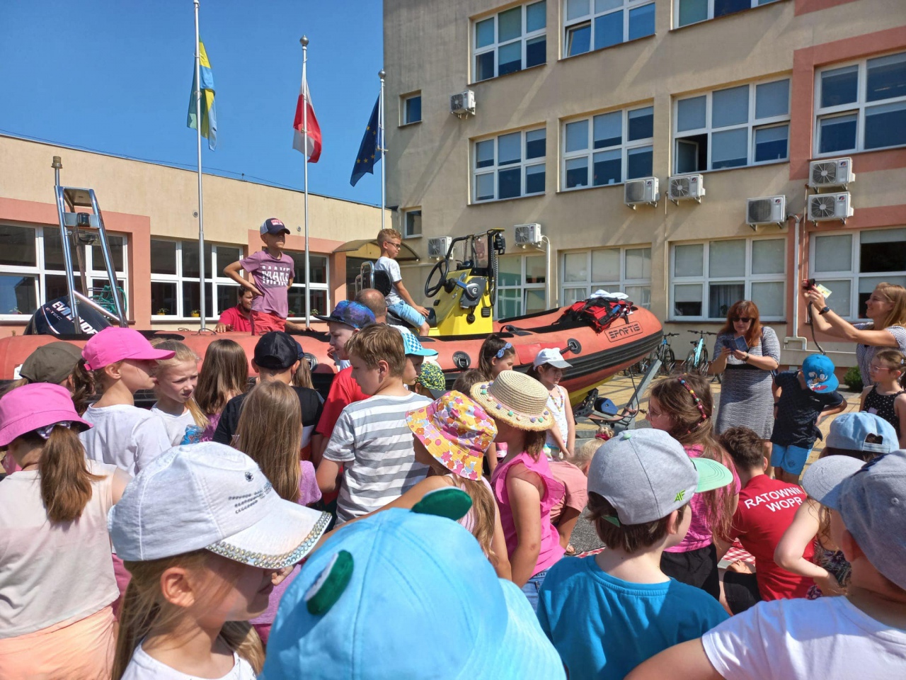 Na placu przed szkołą ratownicy WOPR-OS w atrakcyjny sposób przypominali i utrwalali wiedzę uczniów dotyczącą bezpiecznych zachowań nad wodą, natomiast przedstawiciele policji mówili o zasadach bezpieczeństwa w ruchu drogowym oraz innych sytuacjach, które mogą nas spotkać podczas letniego wypoczynku.