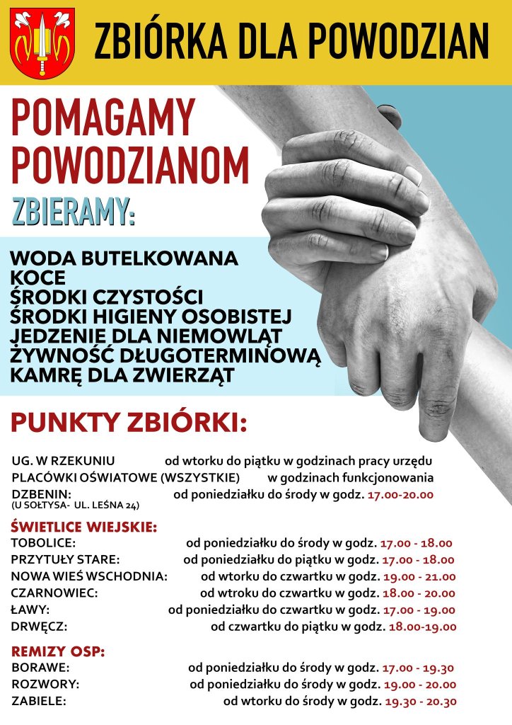 Gmina Olszewo-Borki włącza się w akcję Pomoc Powodzianom koordynowaną przez Powiat Ostrołęcki oraz Miasto Ostrołęka. Zbiórka darów odbędzie się w dniach 16.09-18.09 w godzinach 9:00-17:00. Miejsce: aula Gminnego Ośrodka Kultury w Olszewie-Borkach. Zebrane dary zostaną przekazane do Miejskiego Centrum Zarządzania Kryzysowego w Ostrołęce.