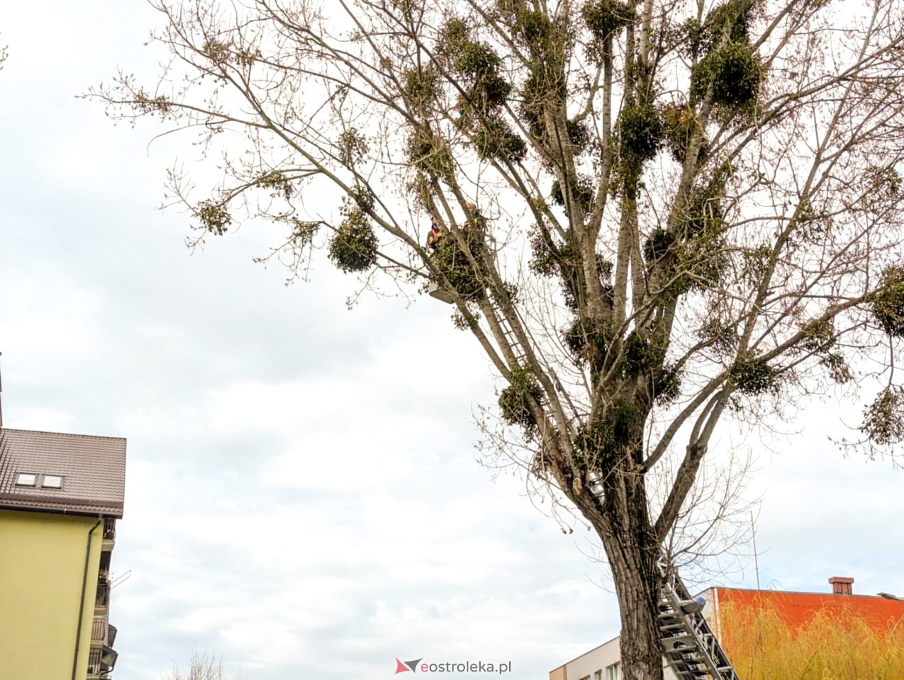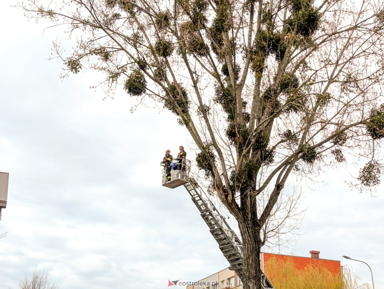 Od tego czasu sporo wody w Narwi upłynęło, a drzewo wciąż stoi. Jednak w poniedziałkowy poranek miejskie służby podjęły się dokładnego sprawdzenia jego stanu. Na miejscu pojawił się dyrektor Wydziału Gospodarki Komunalnej i Ochrony Środowiska, są też strażacy z drabiną, którzy na początek przycinają gałęzie.