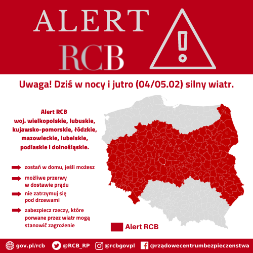 - Uwaga! Dziś w nocy i jutro (04/05.02) silny wiatr. Zostań w domu, jeśli możesz. Możliwe przerwy w dostawie prądu. Nie zatrzymuj się pod drzewami - czytamy w alercie RCB.