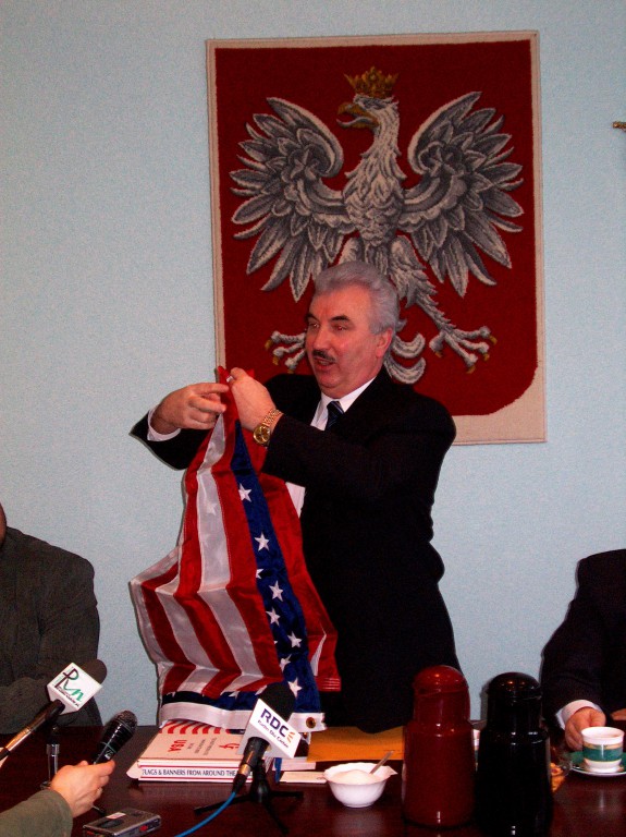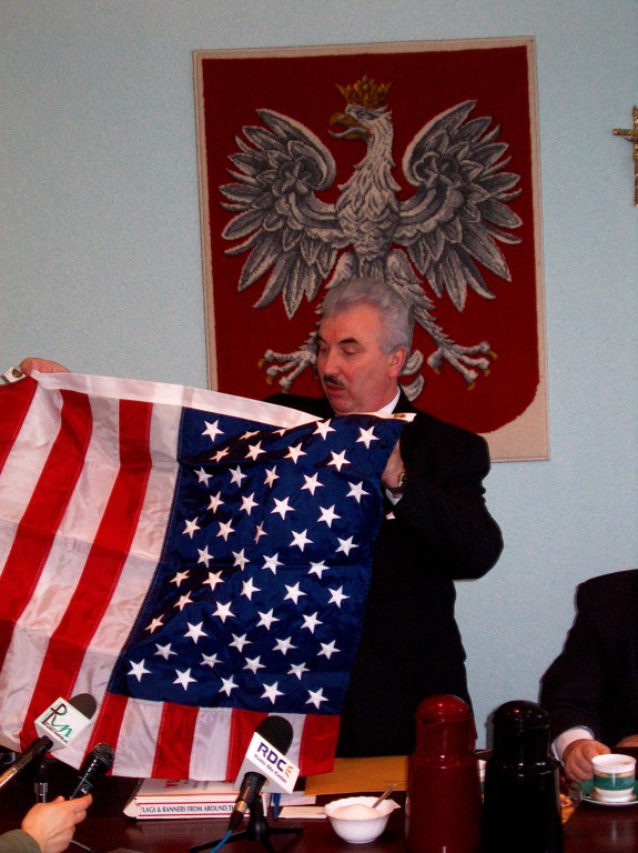 Prezydent Ryszard Załuska z flagą USA, którą przywiózł z wyprawy