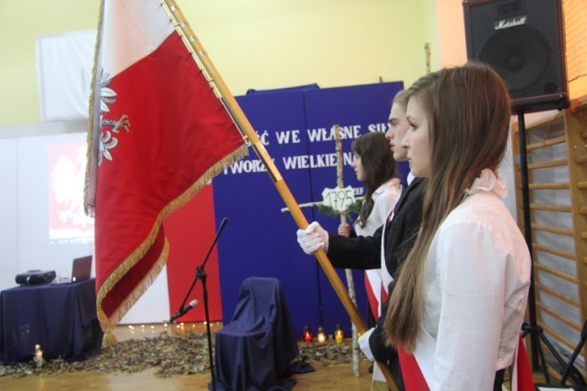 fot. eOstroleka.pl Podczas apelu uczniowie recytowali wiersze i śpiewali pieśni patriotyczne. Prowadzący przypomnieli historię powstań niepodległościowych. Podczas spotkania wielokrotnie podkreślano wolę walki naszego narodu, który po 123 latach niewoli, ponownie pojawił się na mapie Europy.