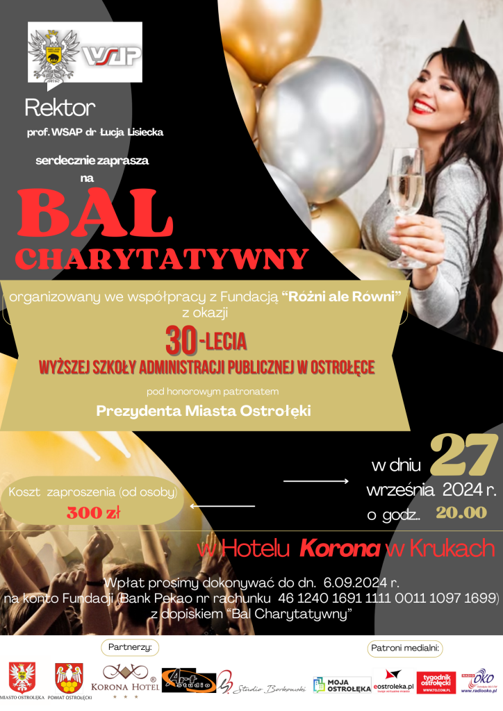Uczelnia jubileusz ten postanowiła uczcić w wyjątkowy sposób, dlatego też oprócz uroczystej inauguracji roku akademickiego 2024/2025, ważnym punktem obchodów będzie właśnie bal charytatywny organizowany we współpracy z Fundacją Różni ale Równi pod honorowym patronatem Prezydenta Miasta Ostrołęki na rzecz podopiecznych tej fundacji. Będzie to więc nie tylko okazja do świętowania trzydziestoletniej działalności naszej Uczelni, ale również ważne wydarzenie charytatywne. Naszym celem jest nie tylko uczczenie jubileuszu, wsparcie podopiecznych Fundacji, ale także zintegrowanie lokalnej społeczności, z którą tak bardzo jesteśmy związani już 30 lat.
