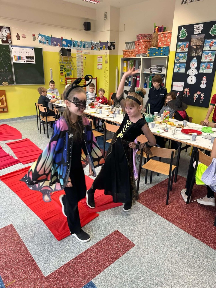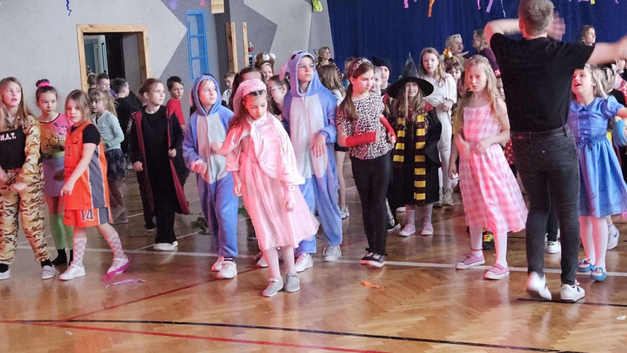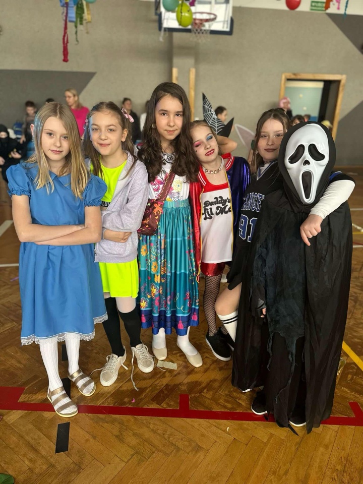 Jako pierwsi na parkiet wkroczyli najmłodsi uczniowie z klas 1-3. Sala wypełniła się wróżkami, superbohaterami, księżniczkami i postaciami z bajek. Dzieci tańczyły przy wesołych melodiach, a kolorowe dekoracje sprawiały, że całość przypominała prawdziwą baśniową krainę.