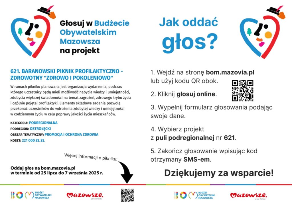 W Baranowie może odbyć się piknik profilaktyczny. Aby tak się stało, należy zagłosować w Budżecie Obywatelskim Mazowsza na projekt przygotowany przez mieszkańców.