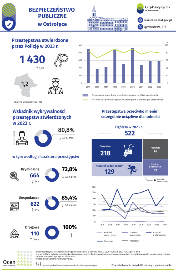 Główny Urząd Statystyczny przedstawił nowe dane dotyczące bezpieczeństwa w Ostrołęce. W 2023 r. odnotowano 1430 przestępstw stwierdzonych przez policję, co oznacza wzrost o 0,6% w porównaniu do 2022 r.
