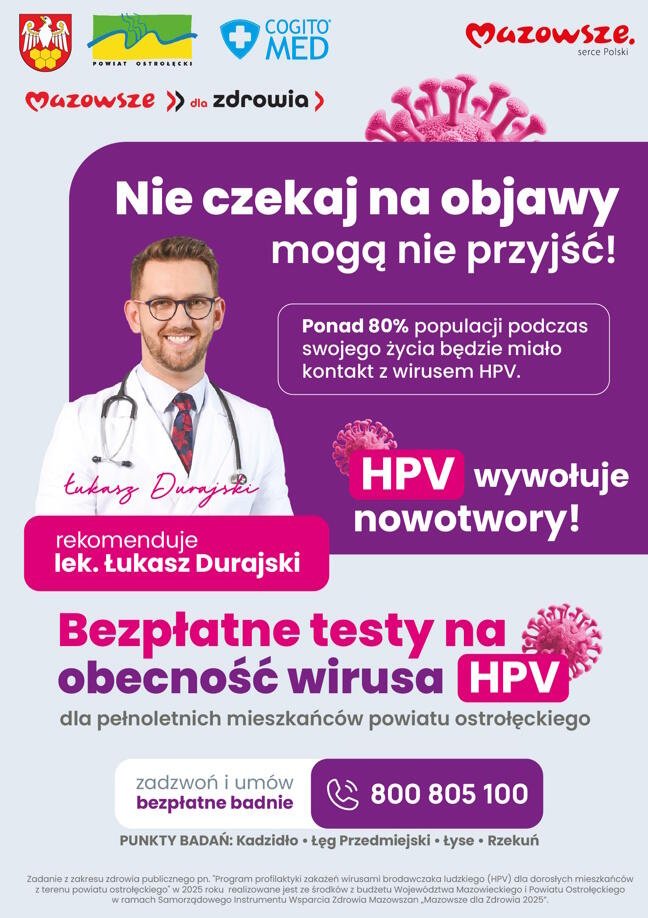 Z uwagi na liczne zapytania, starostwo powiatowe w Ostrołęce przypomina, że bezpłatne badania profilaktyczne w kierunku wirusa HPV odbędą się zgodnie z planem. Celem akcji jest wczesne wykrywanie zagrożeń nowotworowych i zachęcanie mieszkańców do dbania o zdrowie.