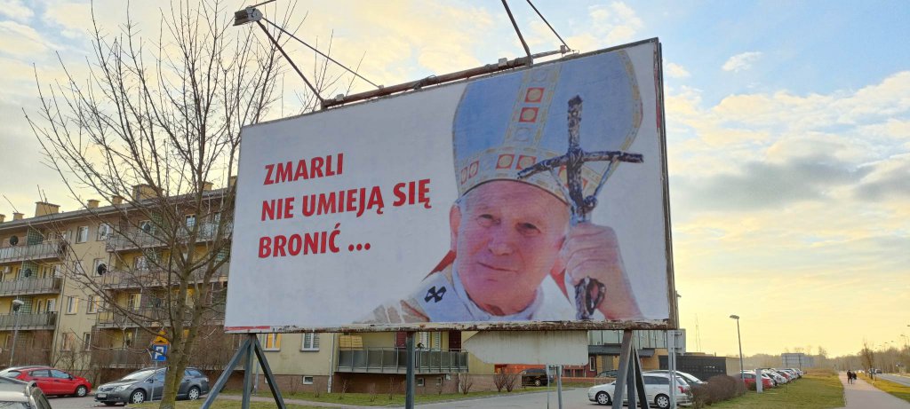 Ostrołęka jest miastem, którego patronem jest św. Jan Paweł II, nie brakuje tu też miejsc upamiętnienia papieża Polaka. Dziś przy al. Jana Pawła II pojawił się billboard z wizerunkiem świętego. "Zmarli nie umieją się bronić" - napisano przy nim, nawiązując zapewne do faktu, że telewizja przygotowała krytyczny materiał o papieżu niemal 18 lat po jego śmierci. Próbowaliśmy ustalić, kto zlecił przygotowanie billbordu - jak się dowiedzieliśmy, wyklejenie billboardu z wizerunkiem papieża to prywatna inicjatywa.