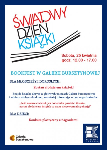 W sobotę, 25 kwietnia Galeria Bursztynowa zaprasza wszystkich miłośników książek, zarówno starszych, jak i młodszych do udziału w imprezie pn. „Bookfest”, organizowaną przez księgarnię Jantar i Galerię Bursztynową z okazji Światowego Dnia Książki.