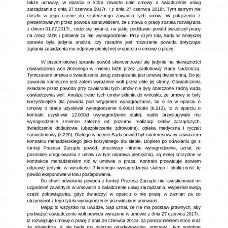 - W przedmiotowej sprawie powód skoncentrował się jedynie na nieważności oświadczenia woli złożonego w imieniu MZK przez "kadłubową" Radę Nadzorczą. Tymczasem, umowa o świadczenie usług zarządzania jest umową dwustronną, do jej zawarcia konieczne jest zatem wyrażenie woli przez obie jej strony - wskazał sąd. Po przeanalizowaniu umów, sąd stwierdził, że kontrakt menadżerski był korzystniejszy dla byłego prezesa MZK, gdyż w oparciu o niego uzyskiwał 12 tys. zł, a w oparciu o umowę o pracę - 9,9 tys. zł.