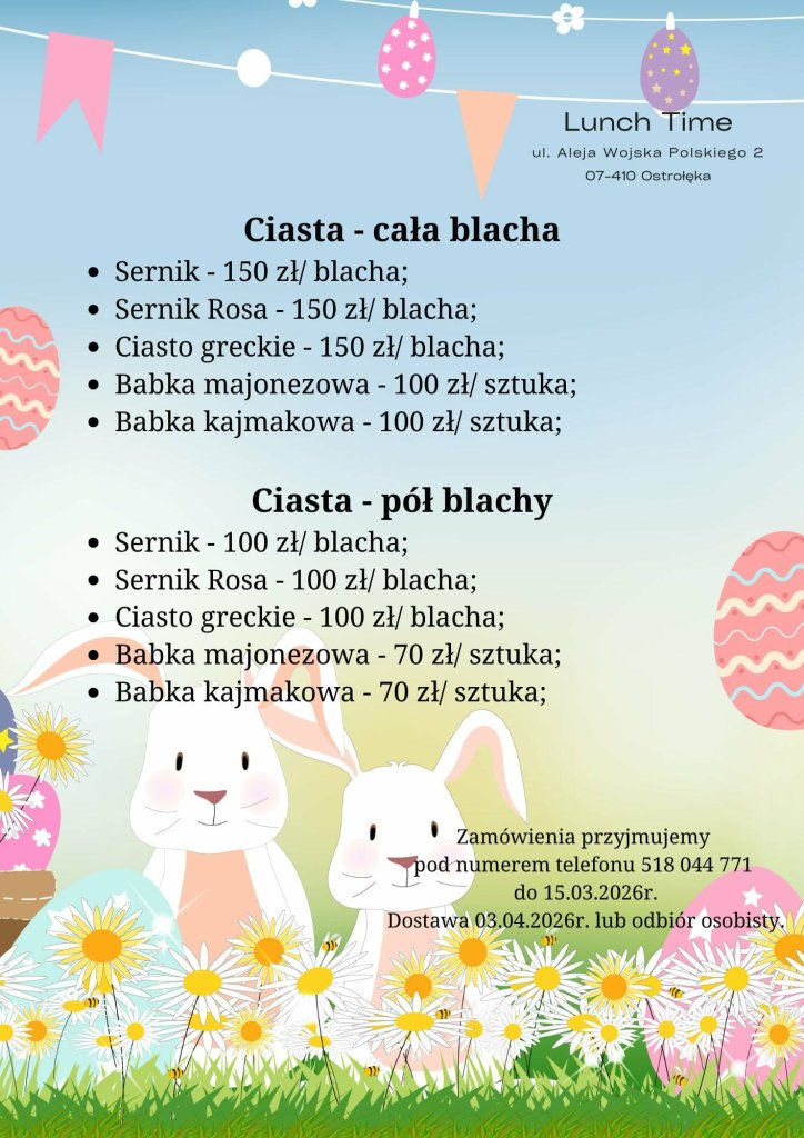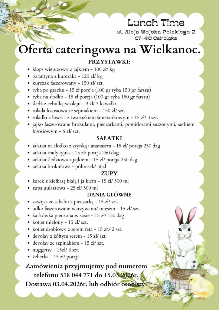 Święta tuż-tuż, a lista potraw do przygotowania rośnie z dnia na dzień? Lunch Time w Ostrołęce ma rozwiązanie - bogata oferta cateringu wielkanocnego z domowymi smakami, tradycyjnymi recepturami i szerokim wyborem dań. Zamówienia przyjmowane są do 15 marca.