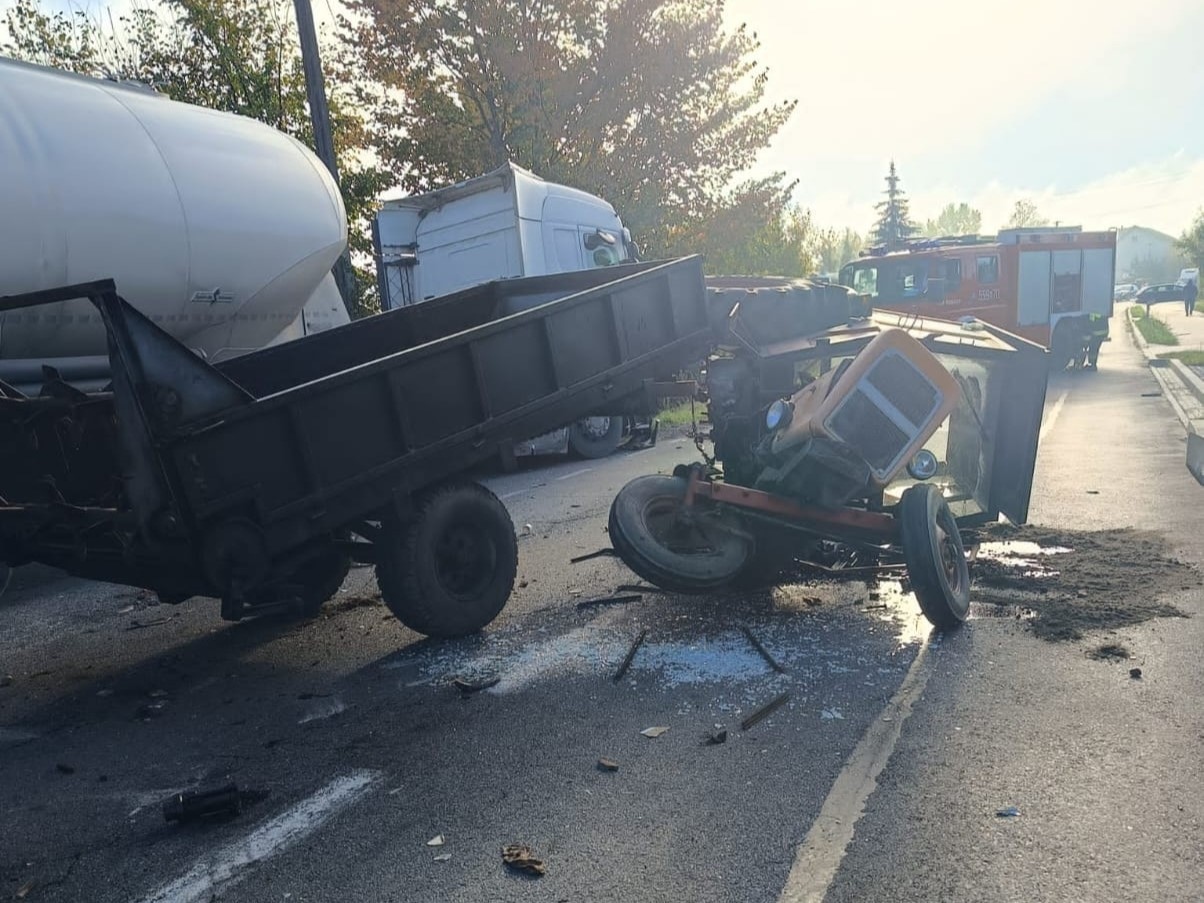 Potężna ciężarówka zderzyła się z ciągnikiem rolniczym. Pojazd został doszczętnie zniszczony, jedna osoba doznała obrażeń i trafiła do szpitala.