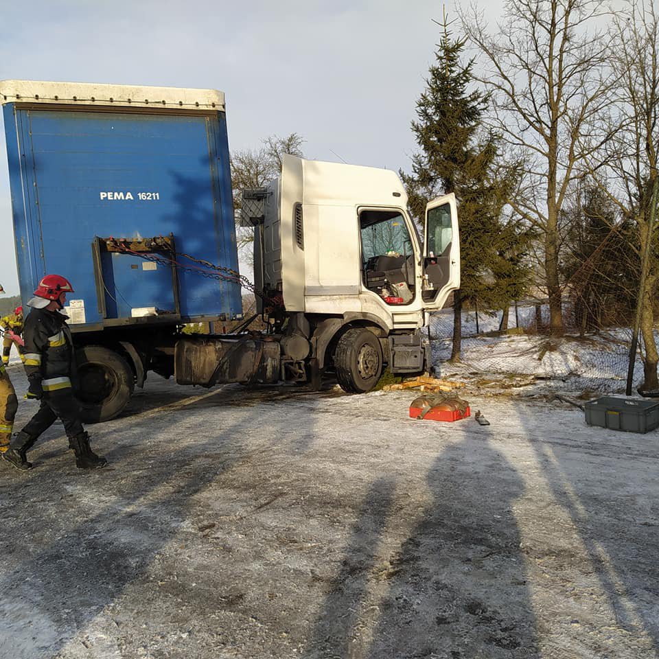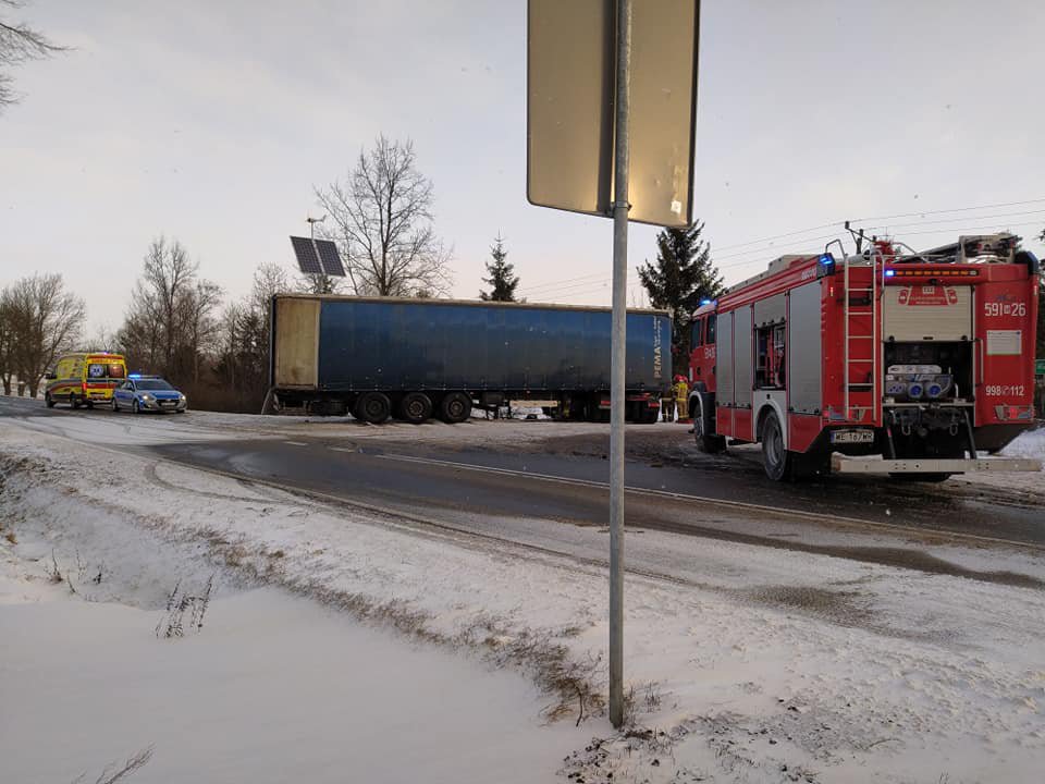 Do zdarzenia doszło w piątek, 21 stycznia około godz. 9:00 w miejscowości Romany Sebory. Kierujący ciężarówką z naczepą na jednym ze skrzyżowań z drogą krajową wpadł w poślizg i wypadł z jezdni uszkadzając ogrodzenie prywatnej posesji.