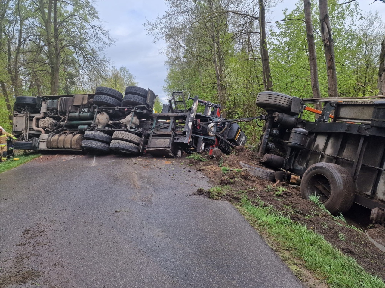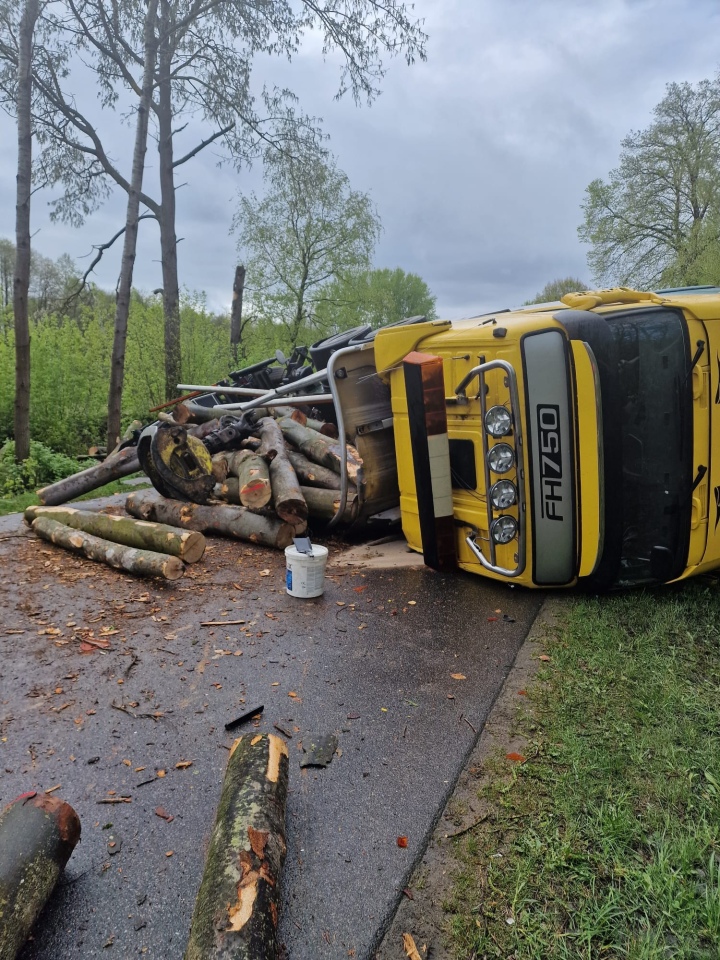 Kierowca ciężarówki wyładowanej drewnem wpadł w poślizg i nie zdołał opanować zestawu pojazdów, na skutek czego cały skład wywrócił się na bok. Znajdujące się na naczepach drewno wysypało się na jezdnię całkowicie blokując przejazd.