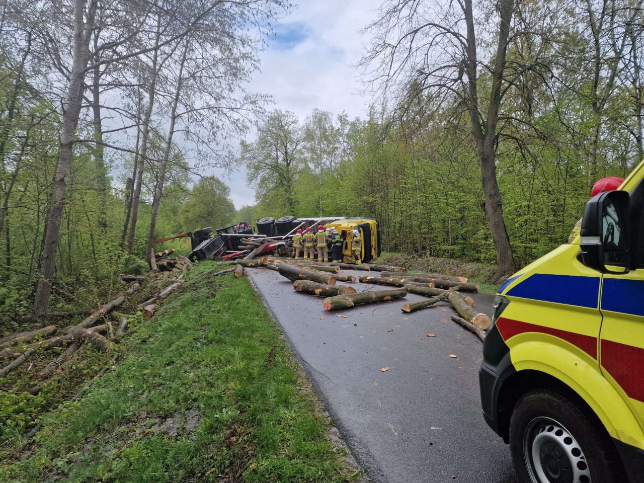 Poważny wypadek ciężarówki przewożącej drewno. Rannego kierowcę zabrano do szpitala.