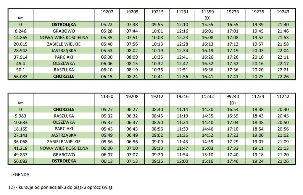 11 czerwca ruszyć mają przewozy pasażerskie koleją między Ostrołęką a Chorzelami. Do konsultacji społecznych przedstawiono projektowany rozkład jazdy na linii nr 35. Co o nim sądzicie?
