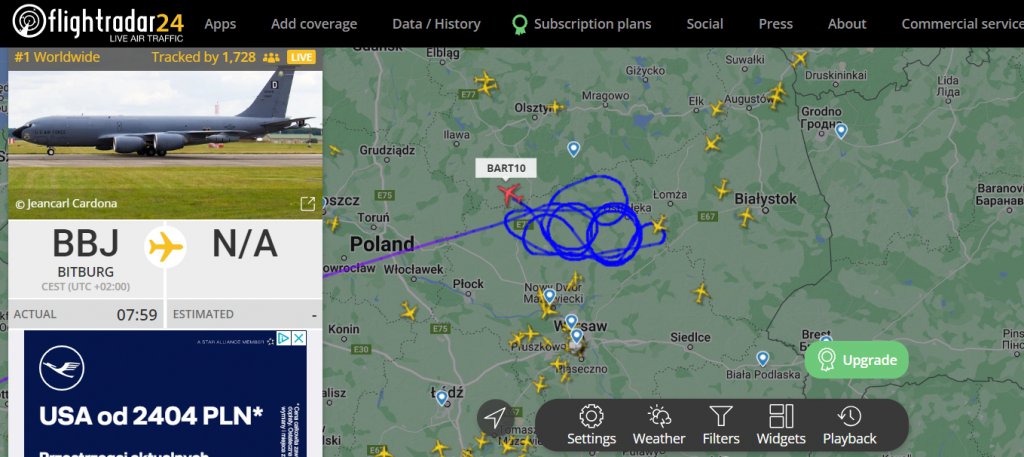 Nad Ostrołęką pojawił się amerykański samolot Boeing KC-135R Stratotanker, czyli cysterna amerykańskich sił zbrojnych pozwalająca tankować samolotom wojskowym bez konieczności lądowania.