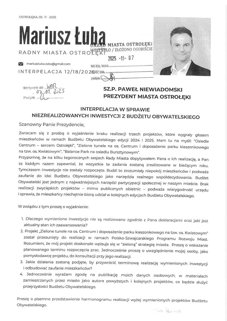 Mariusz Łuba, radny z Ostrołęki, skierował do prezydenta Pawła Niewiadomskiego interpelację w sprawie braku realizacji trzech projektów, które wygrały w Budżecie Obywatelskim. Chodzi o: "Osiedle Centrum - sercem Ostrołęki", "Zielone tunele na os. Centrum i doposażenie parku kieszonkowego na tzw. os. Kwiatowym" oraz "Balance Park na osiedlu Bursztynowym".