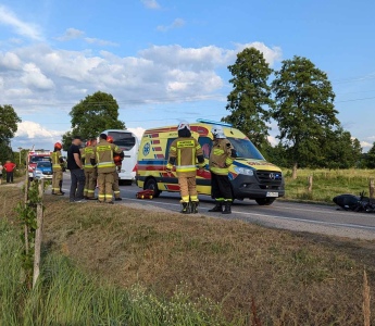 Wypadek z udziałem motocykla i samochodu na lokalnej drodze w okolicach Baranowa. Na pomoc poszkodowanym ruszył śmigłowiec Lotniczego Pogotowia Ratunkowego.