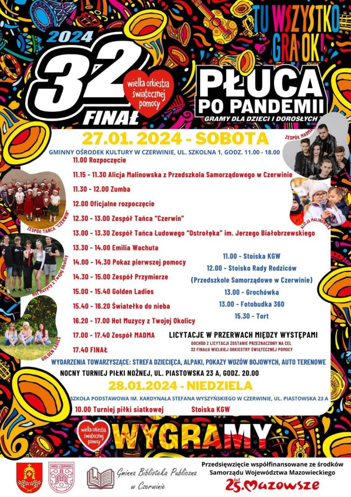 W najbliższą sobotę, 27 stycznia, w Czerwinie odbędzie się 32. finał Wielkiej Orkiestry Świątecznej Pomocy. Wydarzenie odbędzie się w Gminnym Ośrodku Kultury przy ulicy Szkolnej 1.