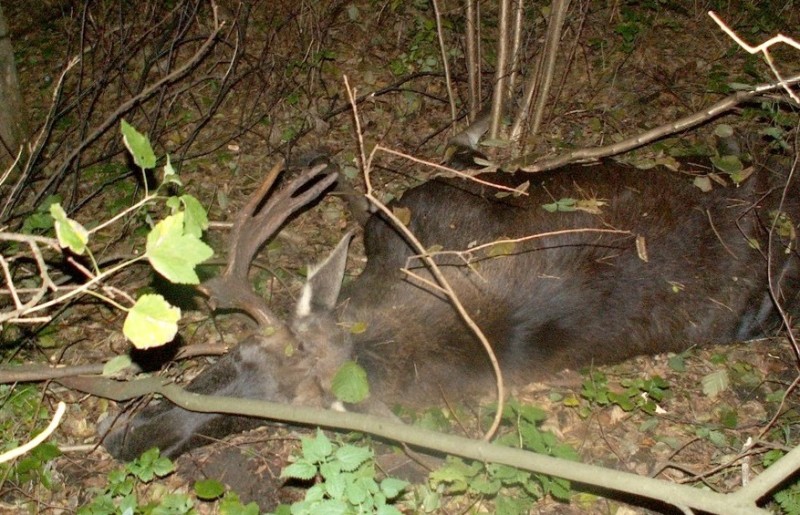 W wyniku zderzenia zwierzę wpadło na dach auta, odbiło się i spadło na pobocze. Następnie clio zjechało do rowu i zatrzymało się na drzewie.