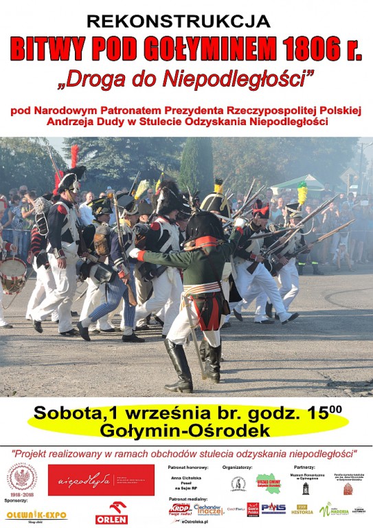 W grudniu bieżącego roku przypada 212. rocznica bitwy, w której starło się ze sobą wojska francuskie i rosyjskie liczące łącznie około 60 żołnierzy. Przygotowana m.in. przez samorząd gminy Gołymin o OSH „Czwartacy” inscenizacja historyczna ,Rekonstrukcja bitwy pod Gołyminem 1806 r. - Droga do Niepodległości” realizowana jest w ramach obchodów stulecia odzyskania niepodległości. Patronat honorowy nad wydarzeniem objął prezydent Rzeczypospolitej Polskiej Andrzej Duda.