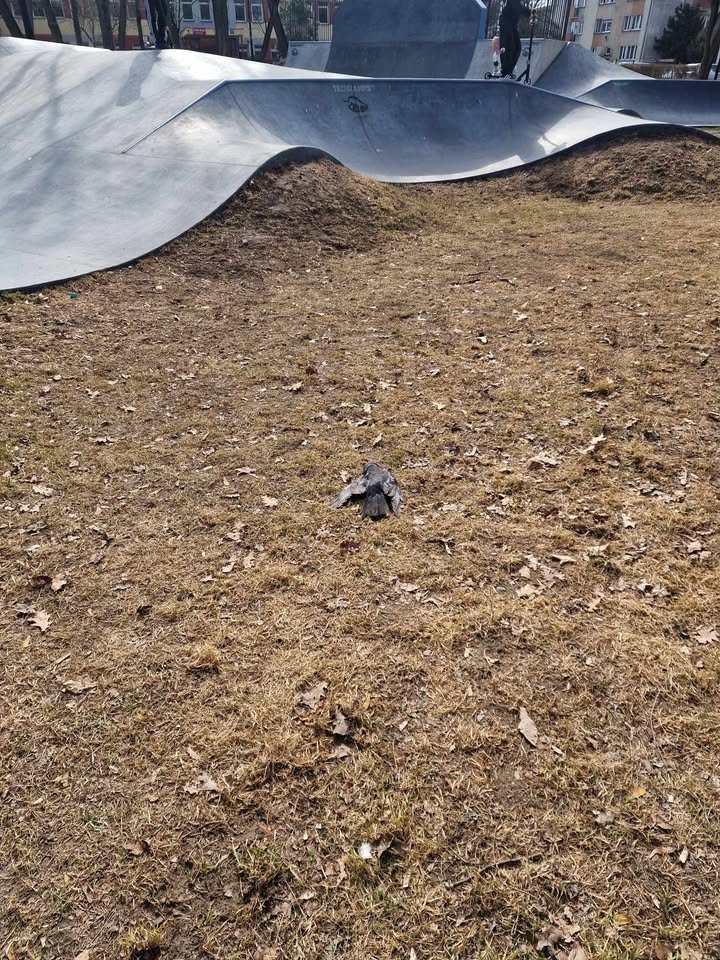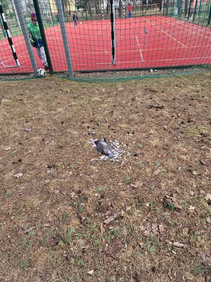 Pierwsze zdjęcie przedstawia teren przy skateparku - leży tam martwy ptak. Padlina zalega na widoku. Druga fotografia jest jeszcze bardziej niepokojąca. Przy ogrodzeniu boiska leży kolejny martwy ptak, tym razem otoczony rozsypanymi piórami. W tle widać bawiące się przy bramce dzieci.