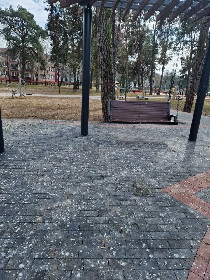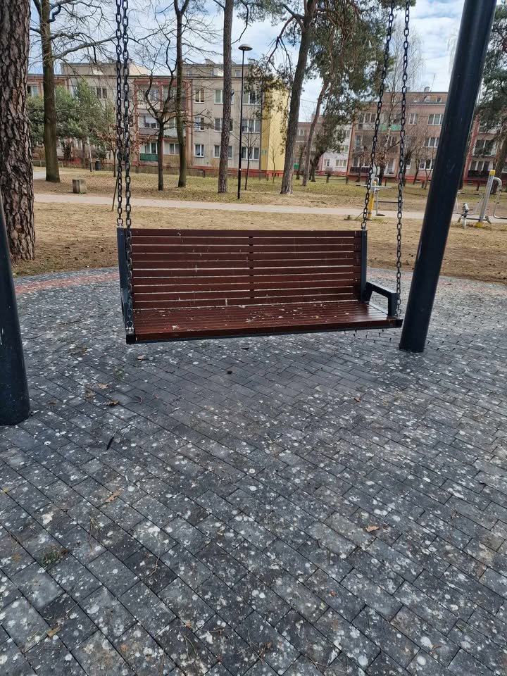 Trzecie zdjęcie to widok huśtawki. Siedzisko i oparcie pokryte są warstwą odchodów ptaków. Trudno wyobrazić sobie, by ktokolwiek chciał korzystać z huśtawki w takim stanie - a przecież to właśnie tego rodzaju miejsca mają zachęcać mieszkańców do wypoczynku na świeżym powietrzu. Kostka brukowa pokryta jest gęsto plamami ptasich odchodów, miejscami zlanych w większe skupiska.
