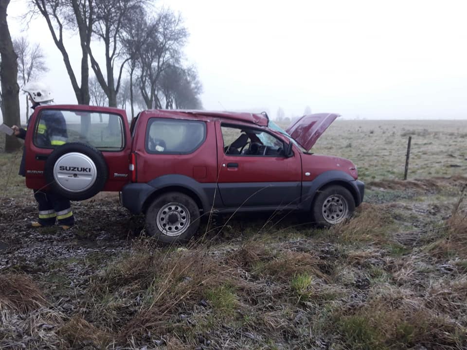 fot. KMP w OstrołęceJak wstępnie ustalono, do wypadku doszło, gdy kierujący osobowym suzuki po pokonaniu jednego z zakrętów stracił panowanie nad pojazdem, zjechał na pobocze a następnie dachował.