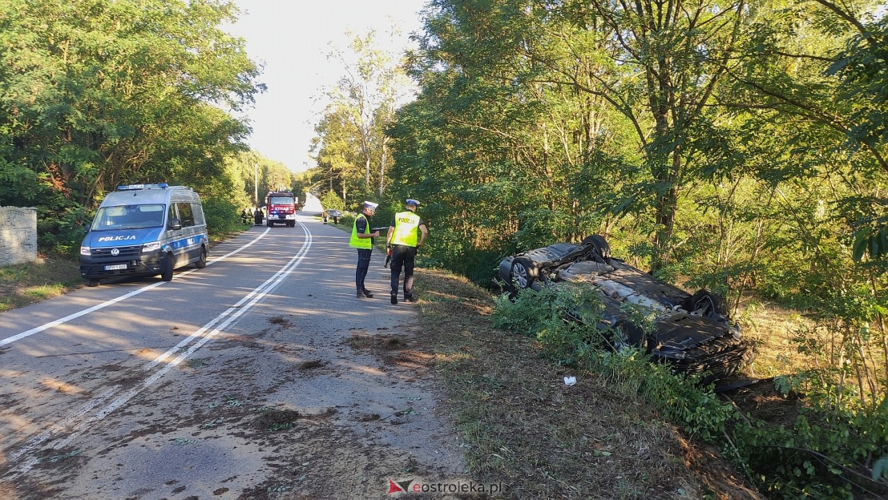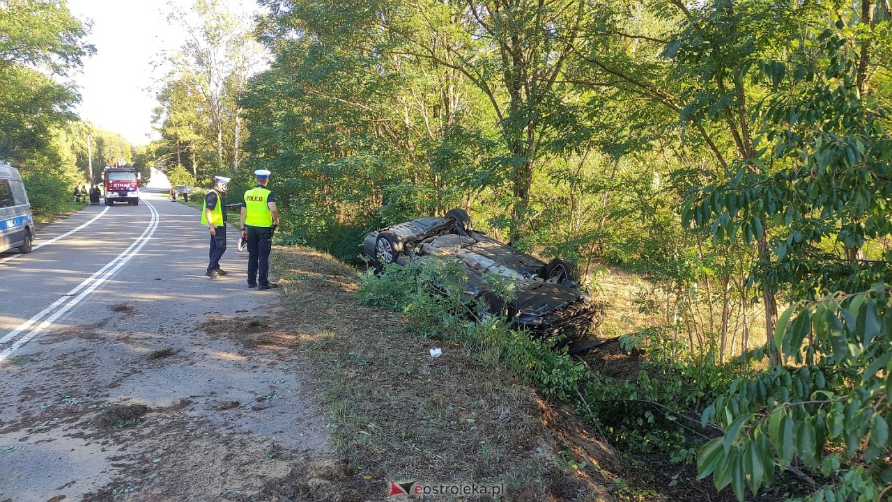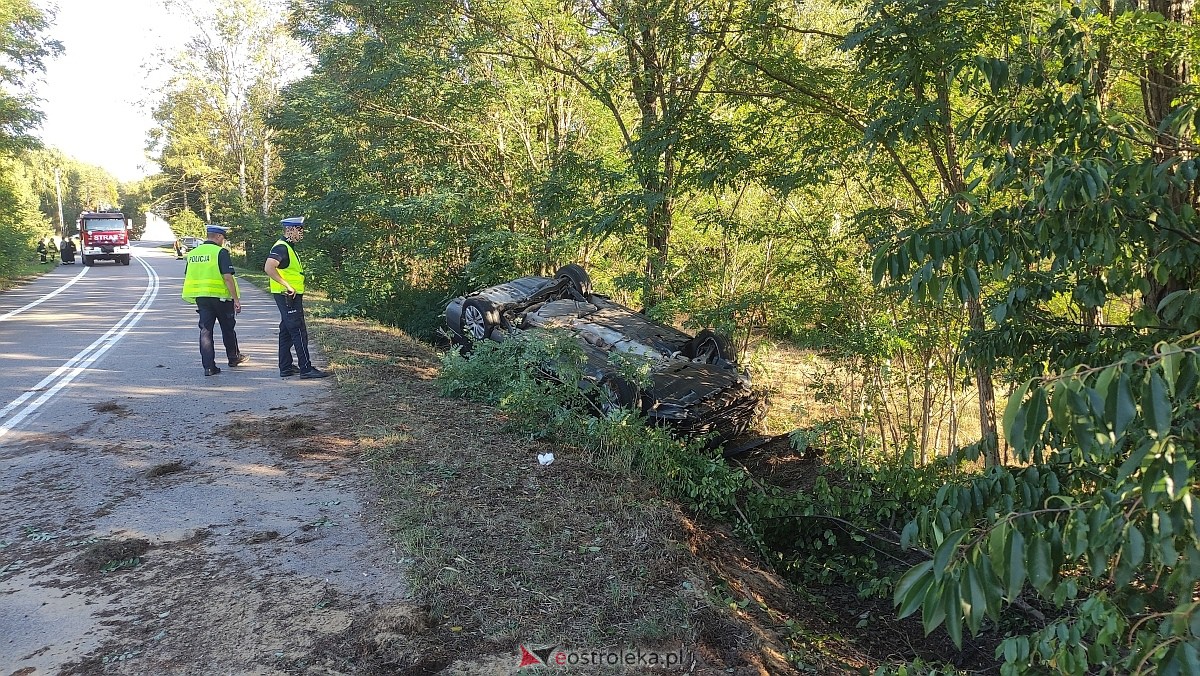 O wypadku służby ratunkowe zostały powiadomione około godziny 16:00 w czwartek, 21 września. Na miejsce zadysponowano zespół ratowników medycznych, straż pożarną i jednostki policji. Ze wstępnych ustaleń wynika, że kierujący vw passatem 48-letni mieszkaniec powiatu ostrołęckiego jadąc od miejscowości Płoszyce w kierunku Dąbrówki stracił panowanie nad pojazdem, zjechał na pobocze i dachował w przydrożnym rowie. Auto zatrzymało się na dachu, kołami w górę, w środku uwięziona została jedna z osób podróżujących autem.