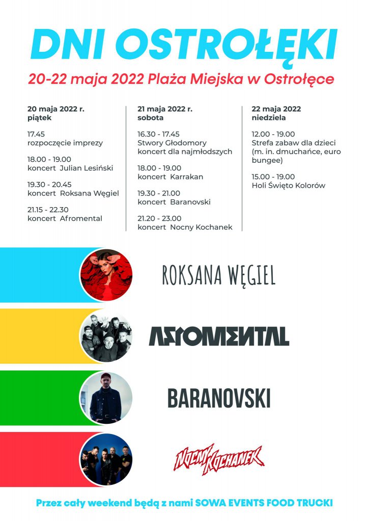 Oprócz koncertów gwiazd oraz festiwalu kolorów, przyjadą także food trucki z daniami kuchni z całego świata. Food trucki będą dostępne w Ostrołęce na plaży miejskiej w dniach 20-22 maja. W piątek od godz. 15:00, w sobotę od godz. 12:00, a w niedzielę w godzinach 12:00-20:00.