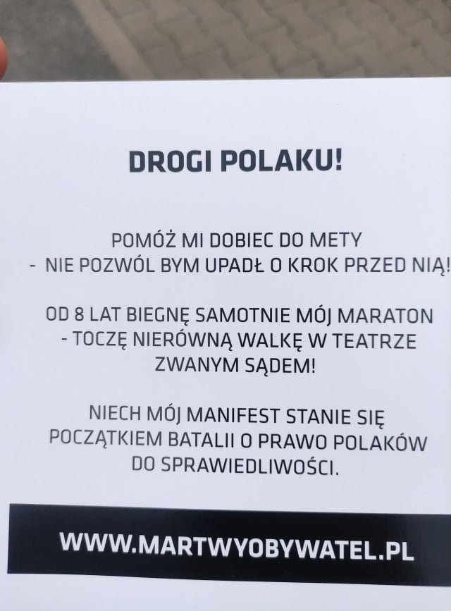 Po 30 latach płacenia podatków, nie otrzymałem pomocy od wymiaru sprawiedliwości i z powodu braku dostępu do rzetelnego dochodzenia należnych mi praw – rozpocząłem akcję społeczną Martwy Obywatel – jako człowiek i przedsiębiorca oszukany i skrzywdzony przez system – ponad 10 lat bezustannej i samotnej walki zmusza mnie do ostateczności – skoro nasz rząd nie jest w stanie zadbać o nasze prawa, to musimy zmienić ten system – doprowadzić do prawdziwych zmian w sądach i urzędach, i przestać tolerować niekorzystne działania polityków, zwane przez nich niesłusznie reformami.