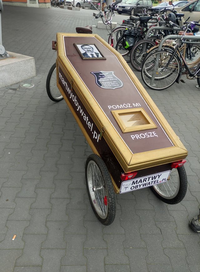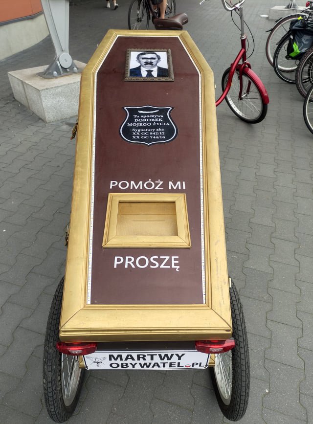 Dziś w Ostrołęce pojawił się człowiek z nietypową instalacją: trumną na kółkach. Zaparkował przed popularną galerią handlową. Tym nietypowym happeningiem pragnął zwrócić uwagę na historię swojego życia, związaną z sądowymi bataliami.