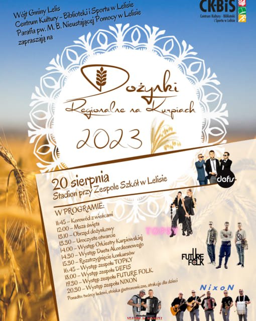 Dożynki na Kurpiach w Lelisie odbędą się w niedzielę, 20 sierpnia. W programie wydarzenia zaplanowano m.in. koncert Orkiestry Kurpiowskiej, Duetu Akordeonowego, zespołu Topky, Defis, Future Folk, Nixon. Dożynki rozpoczną się od korowodu z wieńcami i mszą dziękczynną. Początek wydarzenia o godzinie 11:45.