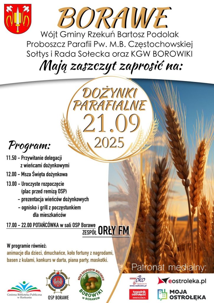 Już 21 września, sołectwo Borowe zaprasza na dożynki parafialne. To wyjątkowe święto, celebrujące zakończenie żniw, będzie doskonałą okazją, by spędzić czas w gronie rodziny i sąsiadów, ciesząc się bogatym programem artystycznym i rozrywkowym.