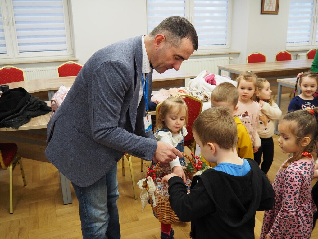 W kilka minut najpiękniejsza choinka w Olszewie-Borkach była gotowa. Zwieńczeniem pracy było wspólne pamiątkowe zdjęcie na tle choinki oraz drobne upominki jakie dzieciom w nagrodę wręczył wójt Krzysztof Grala.