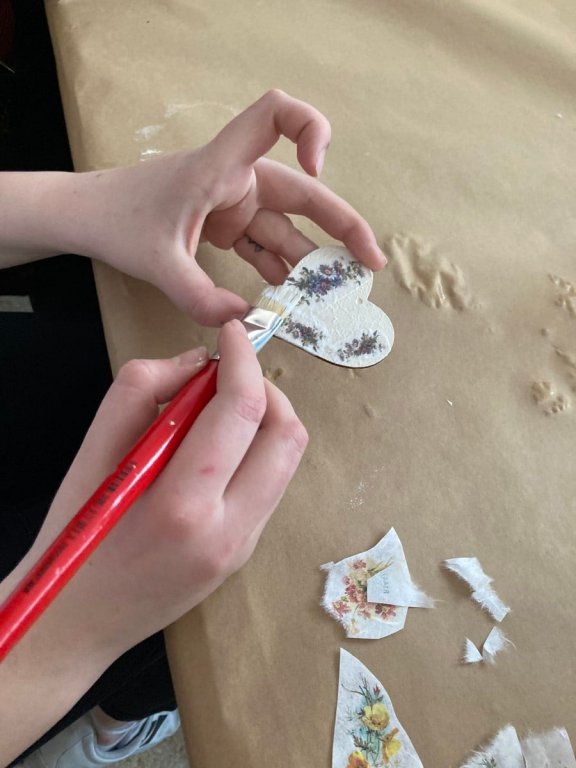 Seniorzy na warsztatach plastycznych przy współudziale młodzieży wykonali piękne serduszka, które później jako upominki zabrali ze sobą do domu.