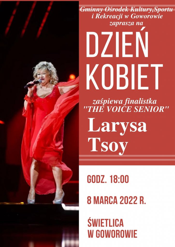 Larysa Tsoy zaśpiewa w Świetlicy w Goworowie 8 marca 2022 r. Początek godz. 18:00.