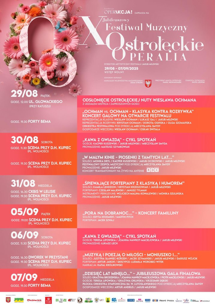 Tegoroczna edycja festiwalu ma wyjątkowy charakter – to już dziesiąte spotkanie z muzyką w ramach Ostrołęckich Operaliów. Z tej okazji na scenach miasta pojawią się znani i cenieni soliści, m.in. Wiesław Ochman, Krystian Ochman, Olga Szomańska, Dorota Osińska, Łukasz Gaj, Jakub Milewski czy Oskar Świtała. Towarzyszyć im będzie orkiestra festiwalowa pod batutą Mieczysława Smydy.