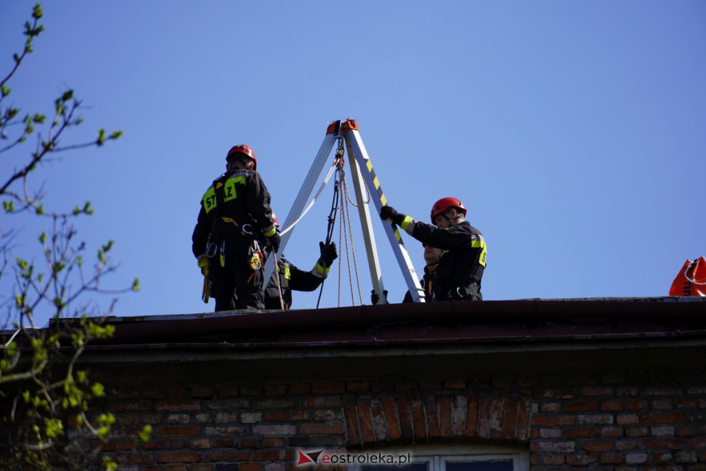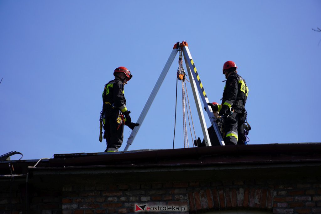 Ewakuacja poszkodowanego z dachu budynku Stora Enso - ćwiczenia z PSP, fot. eOstroleka.pl